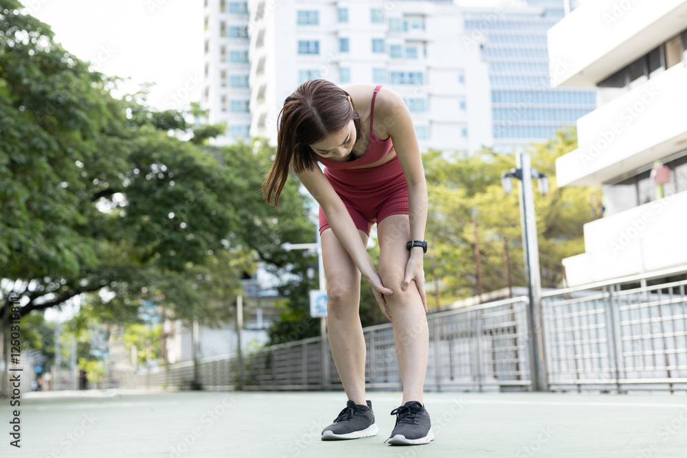 women red sportswear standing problem knee pain painful after exercise. female leg pain. discomfort sprain orthopedic.