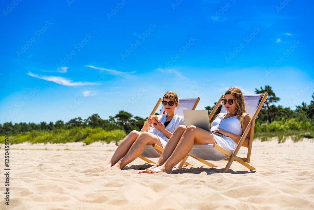 Remote work on beach. Two middle aged women sitting on deckchairs using laptop and smartphone on sandy beach on sunny day