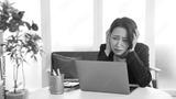 女性、ビジネス、ノートパソコン、悩む、恥ずかしい、日本人、ショック、困る、トラブル、オフィス、炎上、失敗、残念、後悔、悩み、問題、仕事、職場、経営者、人材、がっかり、落ち込む、不運、インターネット、DX、オンライン、web、SNS、動画、働く、表情、ミドル、困りごと、悩み事、ストレス、辛い、あちゃー、間違い、ミス、迷う、憂鬱、プレッシャー、経営、マネジメント、悔しい、期待はずれ、疑問、心配、不安、