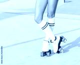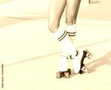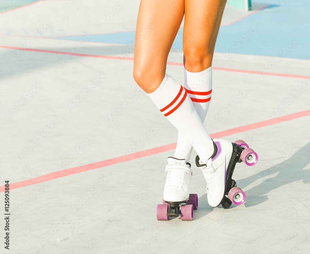 Beautiful long-legged girl posing on a vintage roller skates in denim shorts and white T-shirt in the skate park on a warm summer evening. Part of body.