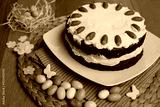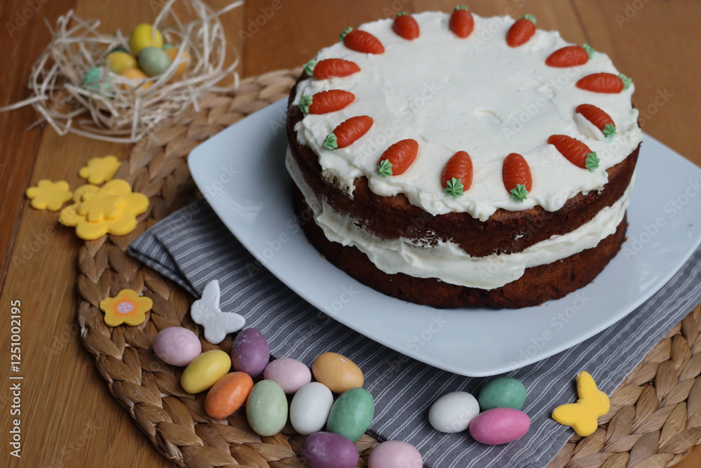 Homemade carrot cake with mascarpone cream cheese icing and mini marzipan carrot decorations with Easter eggs and decorations
