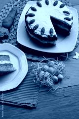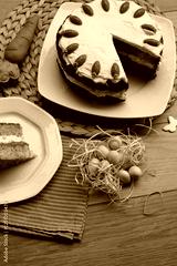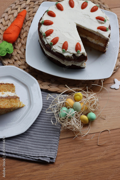 Sliced homemade carrot cake with mascarpone cream cheese icing and mini marzipan carrot decorations with Easter eggs and decorations