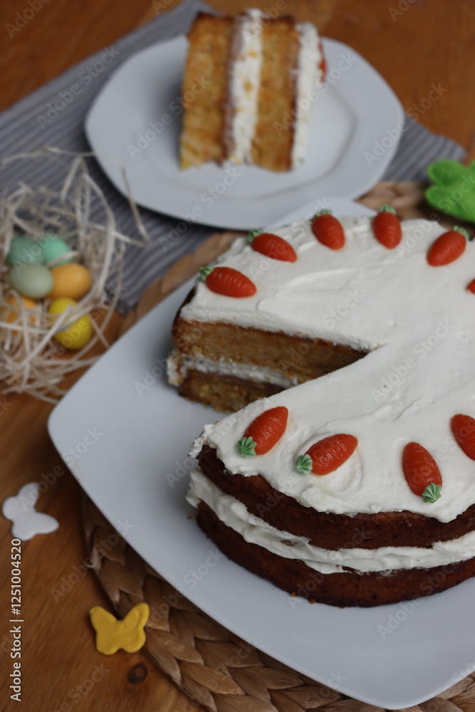 Sliced homemade carrot cake with mascarpone cream cheese icing and mini marzipan carrot decorations with Easter eggs and decorations