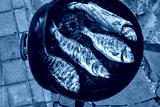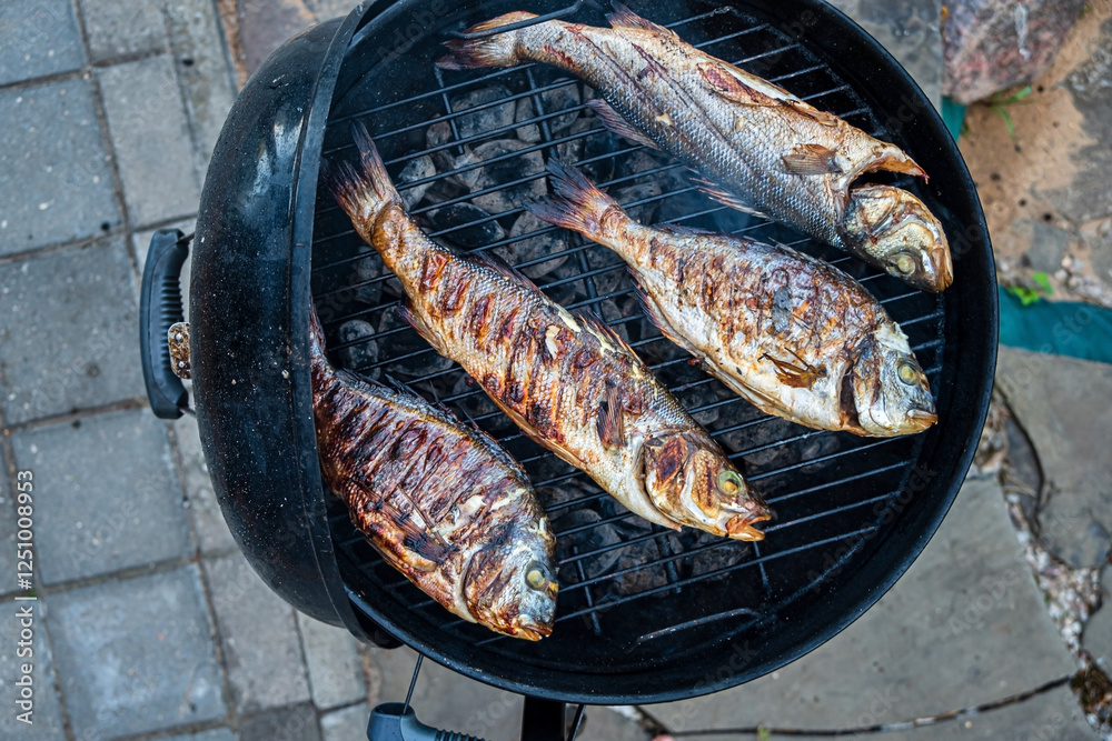 Grilled Fish Sizzling on a Charcoal Barbecue During a Lively Outdoor Gathering on a Sunlit Afternoon in a Vibrant Backyard Setting