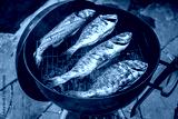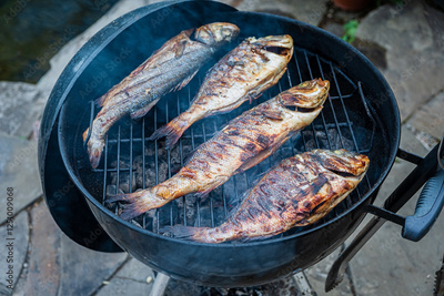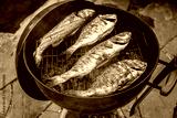 Freshly Grilled Fish Smoking Over a Charcoal Barbecue at a Lively Outdoor Gathering During a Warm Summer Afternoon Near a Serene Water Source