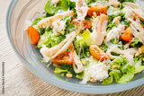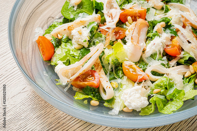 Freshly Prepared Salad Featuring Crisp Greens, Juicy Tomatoes, Creamy Cheese, and Tender Seafood for a Flavorful Dining Experience
