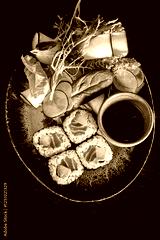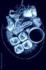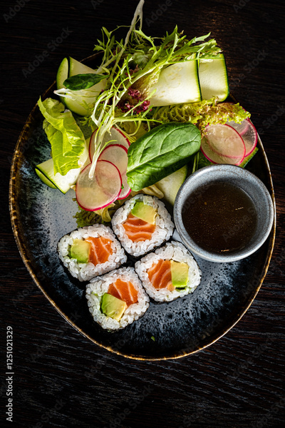 Delightful Sushi Rolls With Fresh Vegetables and Dipping Sauce Served on a Dark Wooden Table at a Vibrant Restaurant