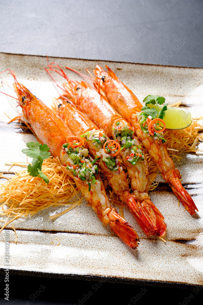 Freshly Peeled Argentinian Shrimp Elegantly Arranged on a Rustic Table With Vibrant Garnishes and Garnished Delicately for a Mouthwatering Culinary Experience