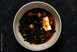 Savory Bowl of Vegetable Miso Soup With Fresh Tofu, Mushrooms, and a Rich Dark Broth Served in a Minimalist Setting