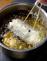 Masterful Chef Creating Delicious Tempura Rolls in a Bustling Restaurant, Showcasing Skill and Artistry During a Busy Dinner Service