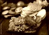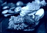 Ingredients for a sandwich - hamburger burger with beef, pickles, tomato and red onion on wooden background.
