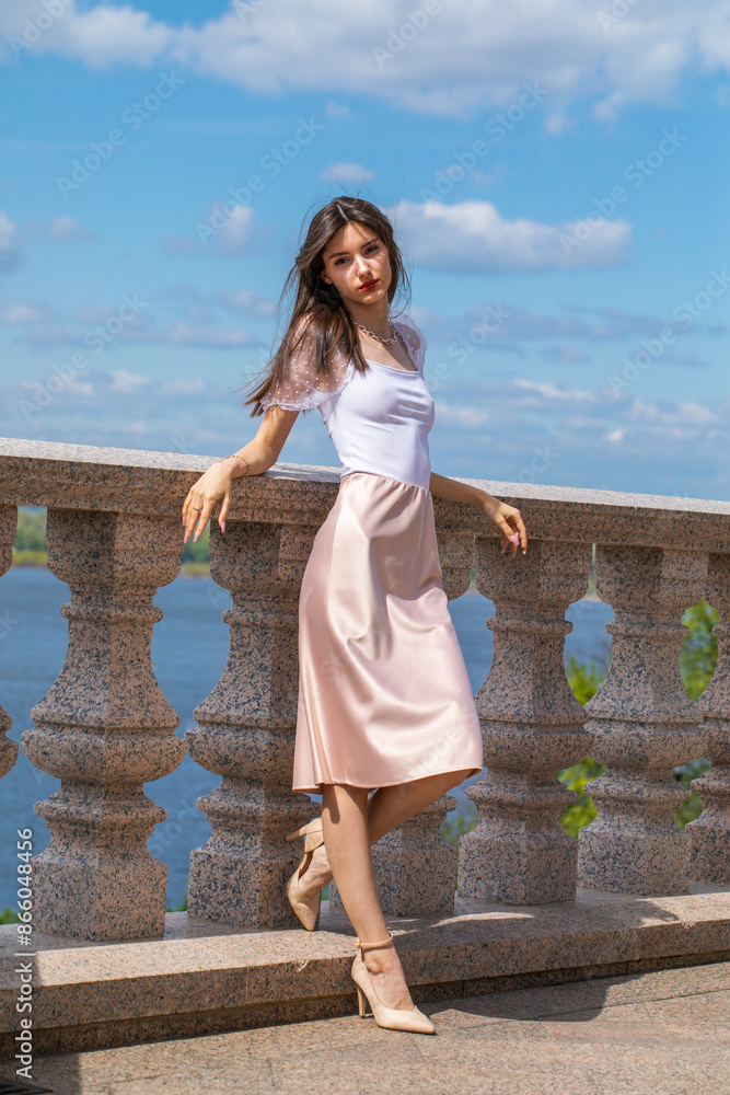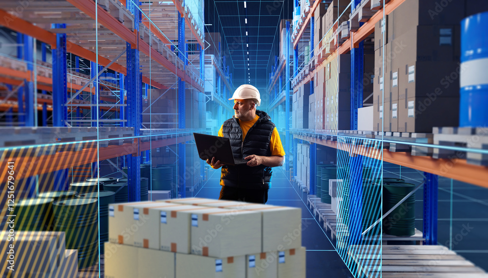 Man warehouse technology developer. Guy with laptop inside warehouse building. Man stands among racks of storage pallets. Developer is thinking about creating warehouse software. Storage innovation