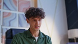 HR manager talking video meeting making notes in notebook at desk closeup.