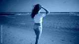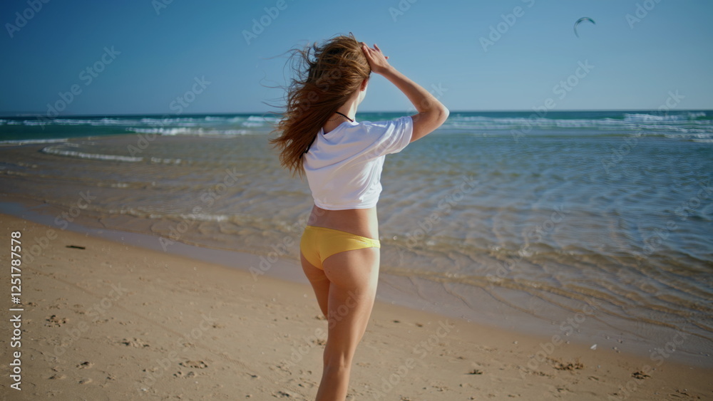 Vacation model enjoy breeze on summer beach closeup. Smiling woman posing camera