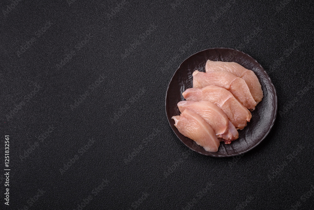 Raw chicken or turkey fillet cut into slices with salt, spices and herbs