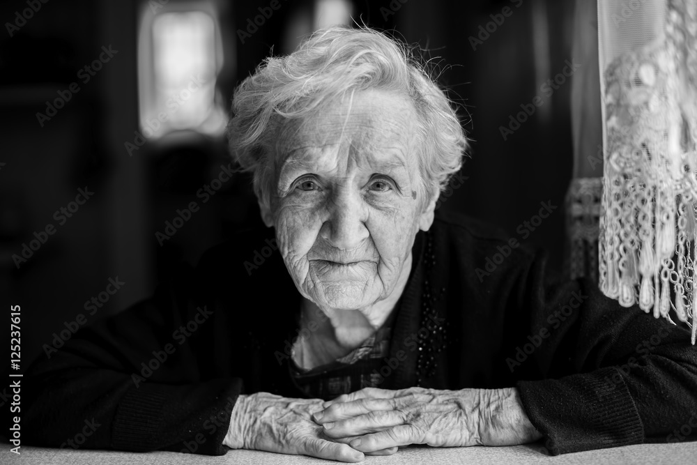 Black and white contrast portrait of an elderly woman.