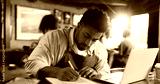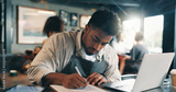 Business owner, laptop and man in restaurant, writing and planning for food menu, taxes report and internet. Person, manager or employee in coffee shop, pc or schedule for workers and budget