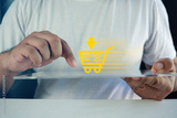 Man engaging with online shopping cart interface. Virtual interface of online shopping cart