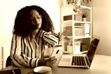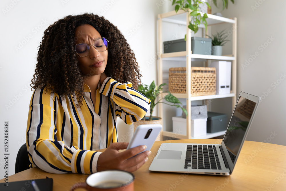 Young Black woman suffering from neck pain. African American female using phone at home self massaging neck