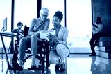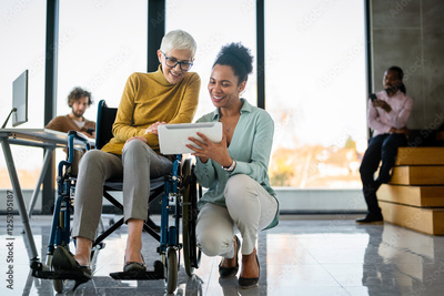 Disabled woman in wheelchair looking at computer, discussing startup project with interracial team