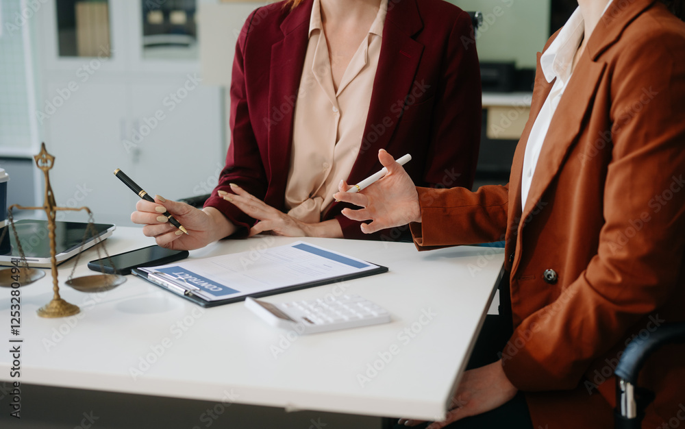 Business and lawyers discussing contract papers with brass scale on desk in office. Law, legal services, advice,