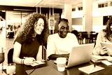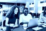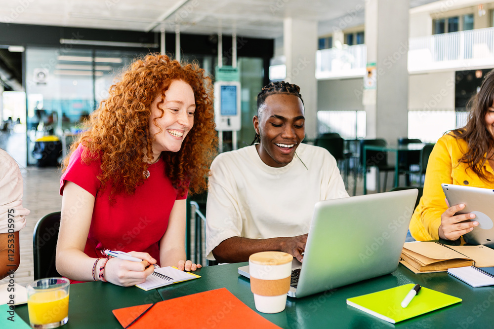 Diverse group of college students studying together at university cafeteria. Happy classmate friends talking while preparing exam or doing group work sitting on bar table outside. Education concept.