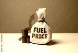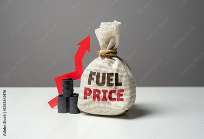 Rising crude oil and fuel prices, money bag and barrels of oil with a red arrow pointing up. Energy market volatility, petroleum industry trends, economic impact,