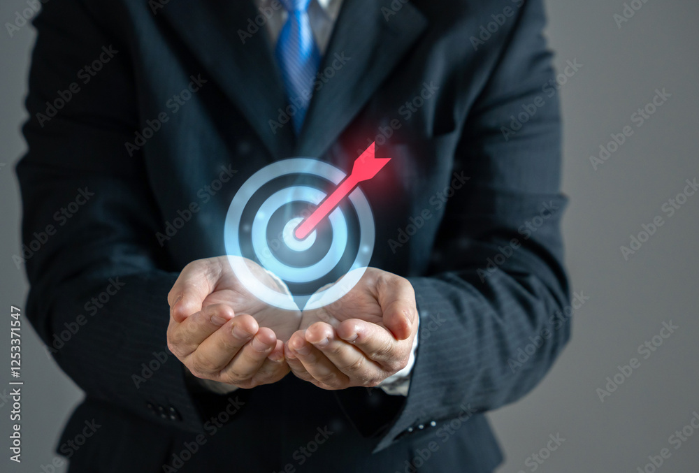Businessman holding an arrow at a target. Concept of a goal and its achievement. Achieving objectives, business strategy, career ambitions, success planning, financial targets