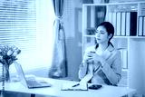Asian businesswoman sitting at desk in office with documents and laptop computer.