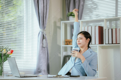 An Asian businesswoman sits at her desk, exhausted from working for a long time.