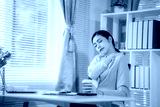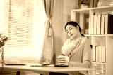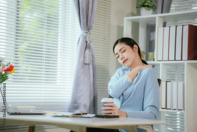 An Asian businesswoman sits at her desk, exhausted from working for a long time.