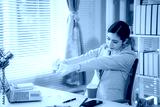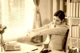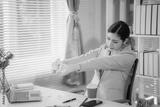 An Asian businesswoman sits at her desk, exhausted from working for a long time.