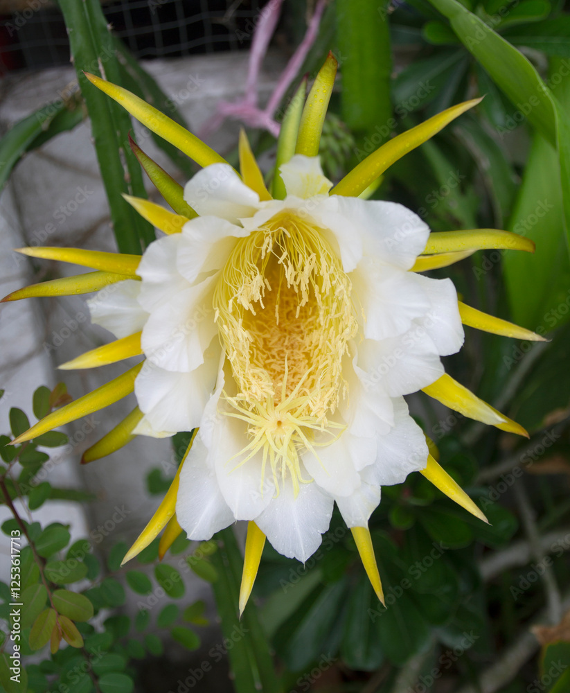 A large white dragon fruit flower with a yellow center on a dragon fruit plant.