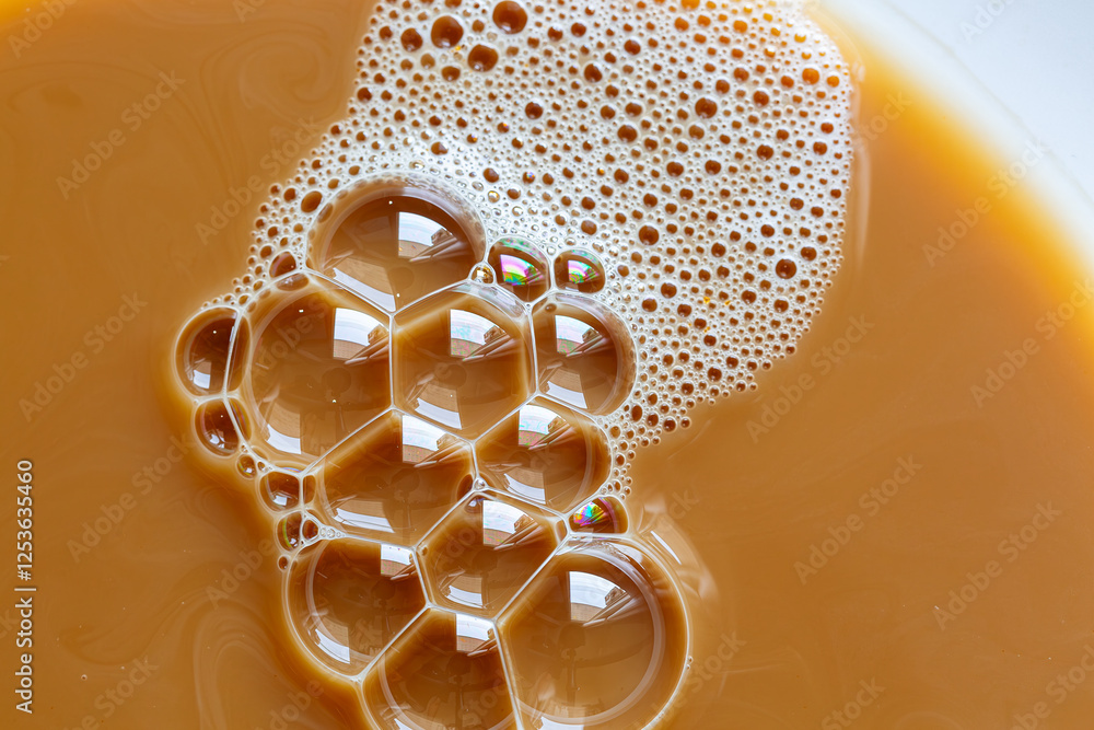 Close-up macro coffee foam texture,Close-up of Cold latte drink with ice cubes,Bubbles of coffee foam close-up. Selective focus. The texture of the coffee foam of freshly brewed aromatic coffee.