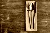 Concept of simple organic food - laconic design cutlery set on rustic wooden table and linen tissue. Top view.