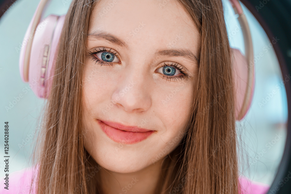 A close portrait of a young woman girl, whose eyes reflect the ring light lamp at home.