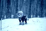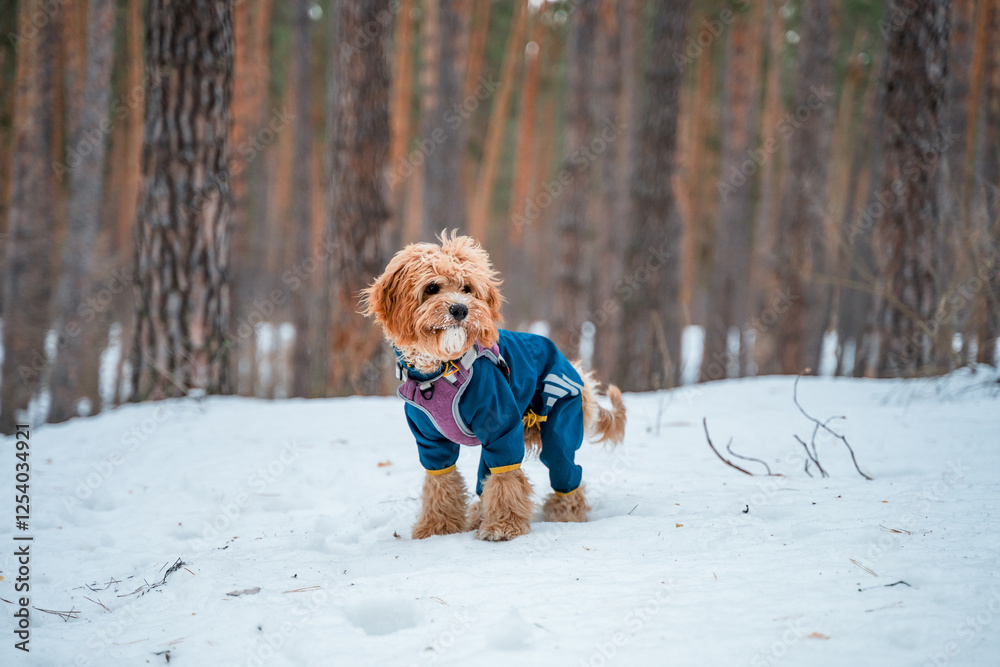 A Cavapoo or Cockapoo breed dog in clothes in the snow in the forest in winter. Close-up of a curly brown Maltypu. A cross between a poodle and a spaniel.