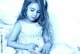 girl child rad book in bed, dressed in pink