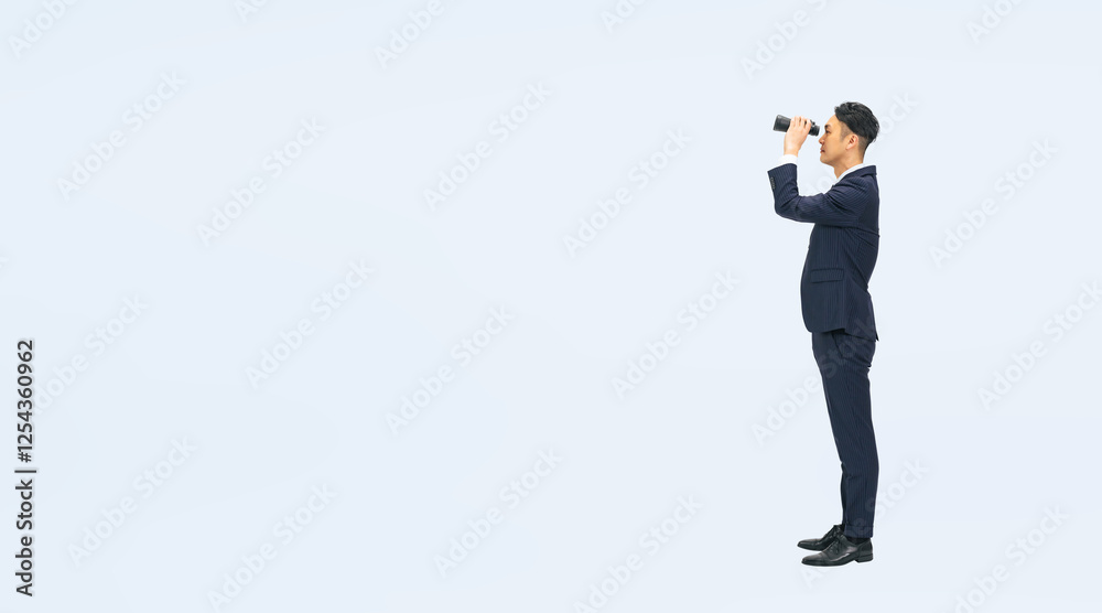双眼鏡で遠くを見るミドル男性ビジネスパーソンの全身写真(切り抜き背景透過PNGも販売しております。作成者リンクから「PNG」で検索してください)