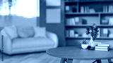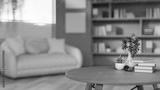 A close-up of a round wooden coffee table set in a contemporary living room.