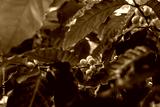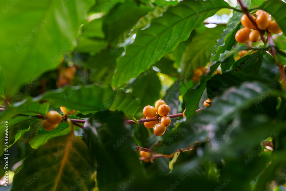 Close-up photo of orange-colored coffee tree fruits growing