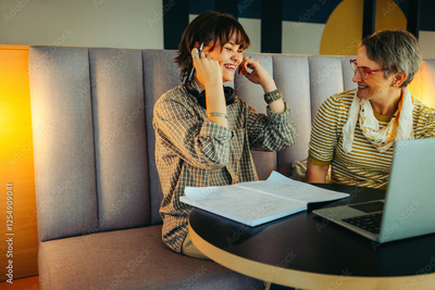 Cheerful tutor and pupil enjoying an extra class session with open notebooks and a laptop on the table