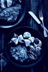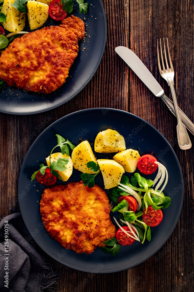 Breaded fried pork chop with fresh vegetable salad and potatoes on wooden table