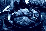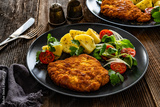 Breaded fried pork chop with fresh vegetable salad and potatoes on wooden table