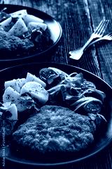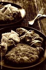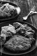 Breaded fried pork chop with fresh vegetable salad and potatoes on wooden table