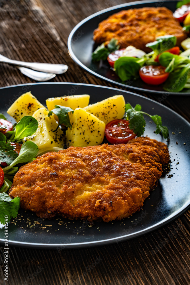Breaded fried pork chop with fresh vegetable salad and potatoes on wooden table