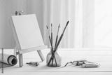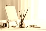Artistic paintbrushes, canvas on easel, tubes of oil paint, pale