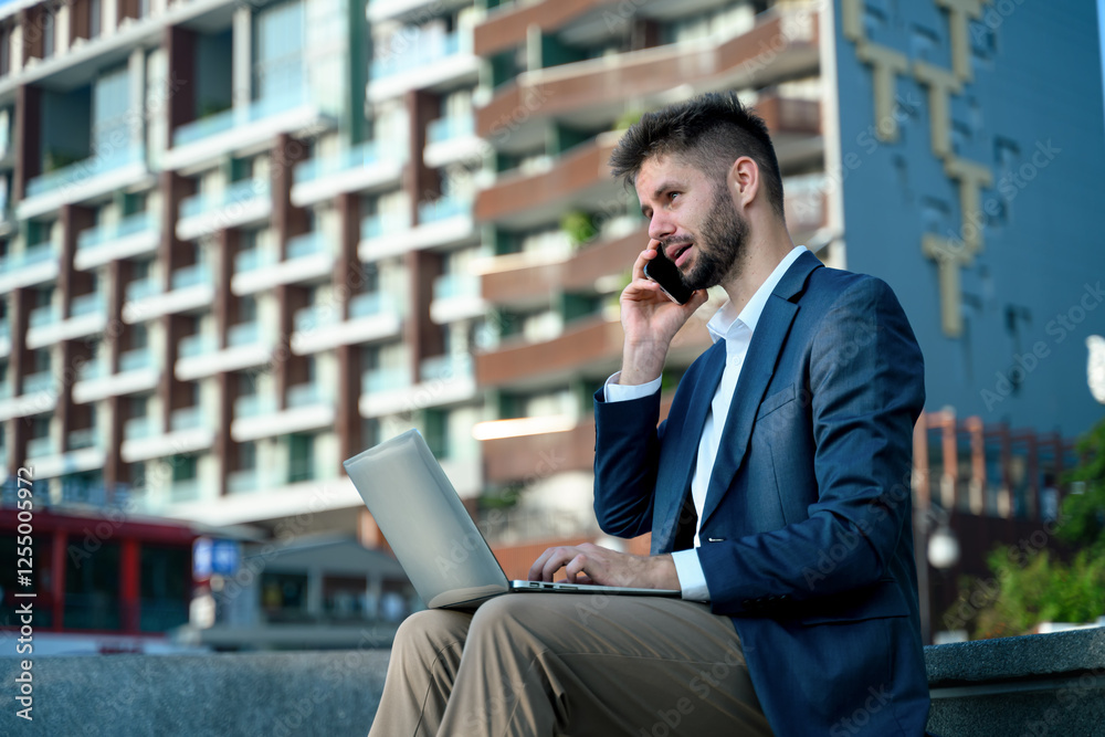 Confident businessman sitting outdoors with a laptop and speaking on his phone