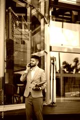 Business executive having a phone conversation outside a glass office building