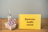 Electronic Health Record EHR concept. Digital version of a patient’s medical history, including diagnoses, treatments, test results, and medications. Notes and a basket of pills